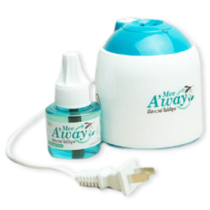 - เสียบขวด Mee A’way ชนิดน้ำแบบเติมเข้ากับตัวเครื่องไล่ยุงไฟฟ้าและหมุนเกลียวขวดจนแน่น